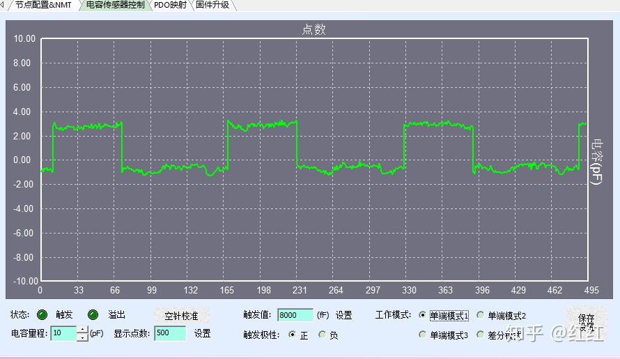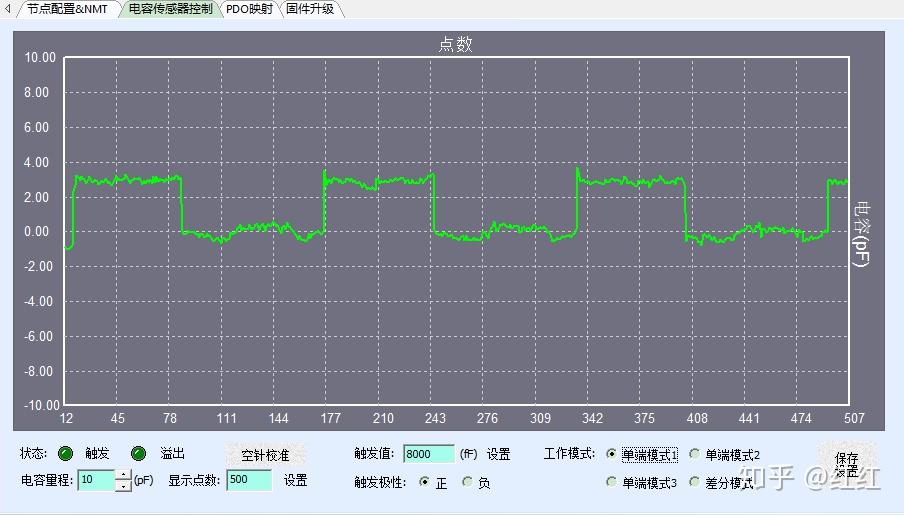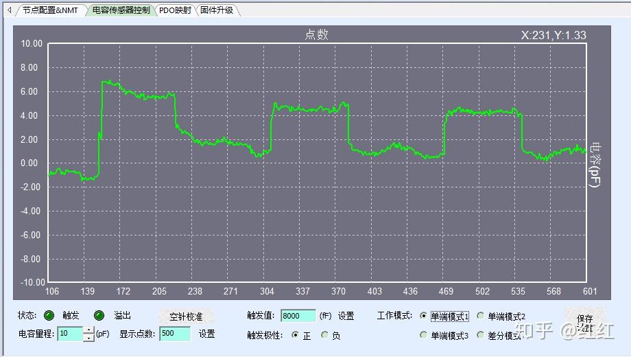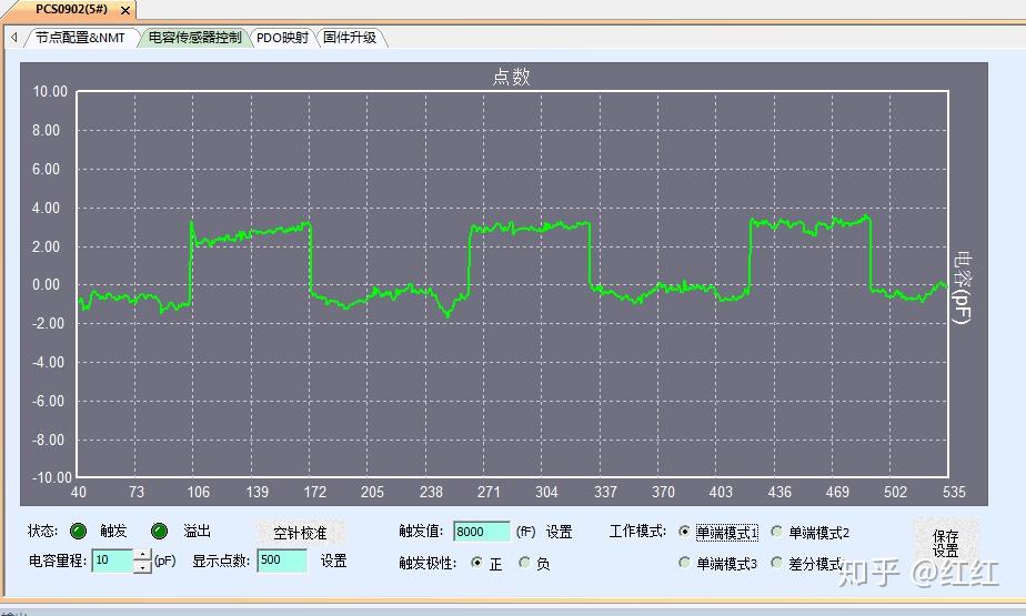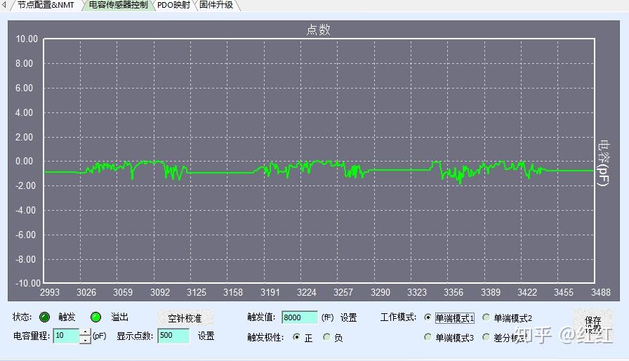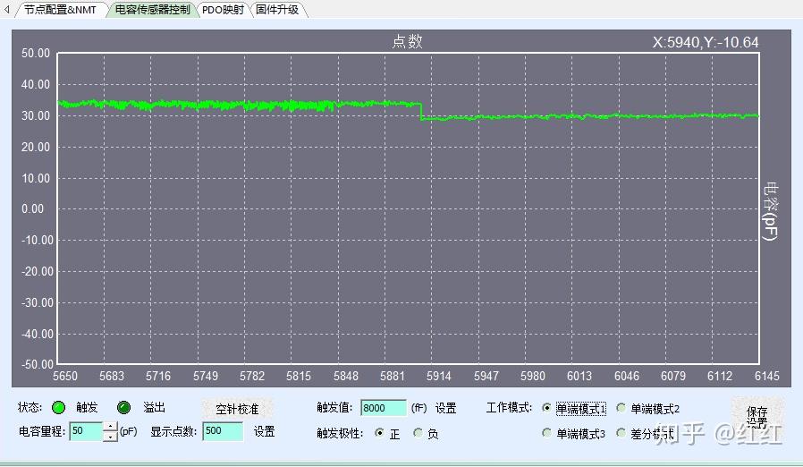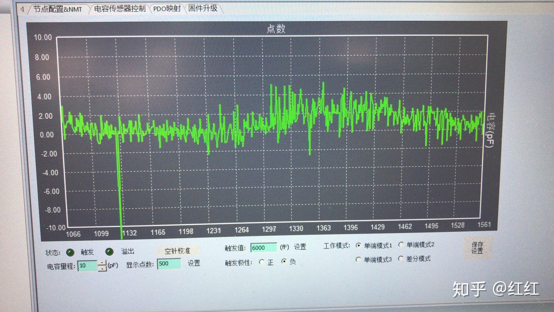 可以看到空针时的电容检测值波动比较大,检测值不稳定。