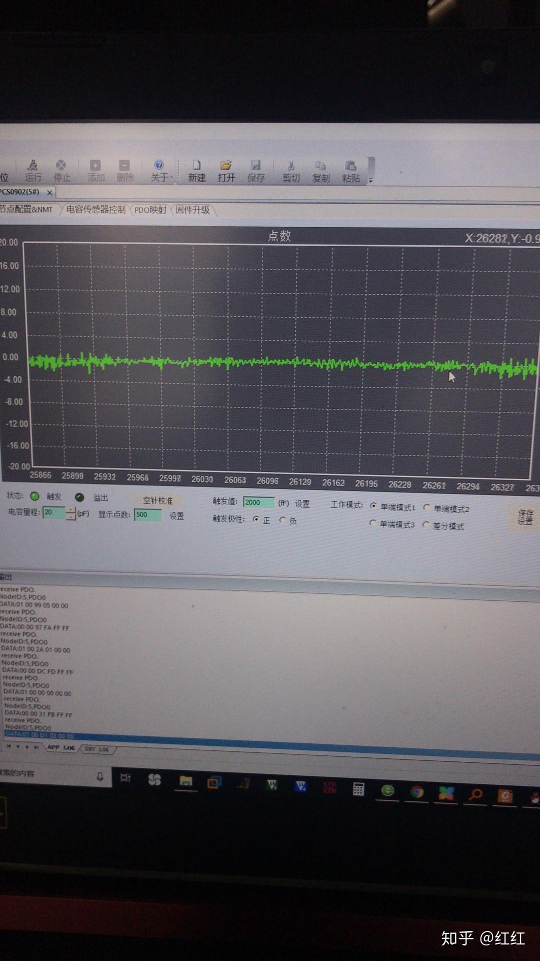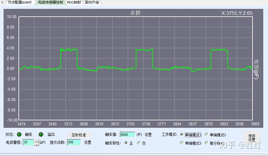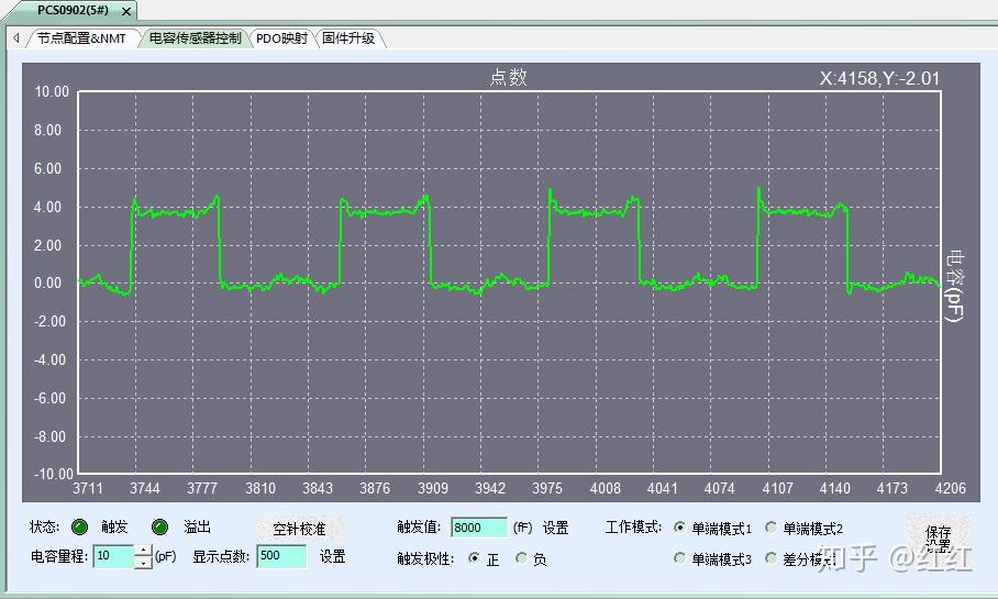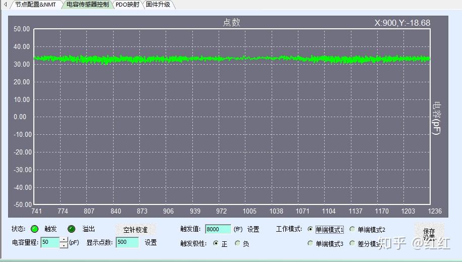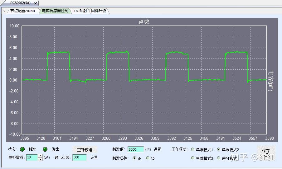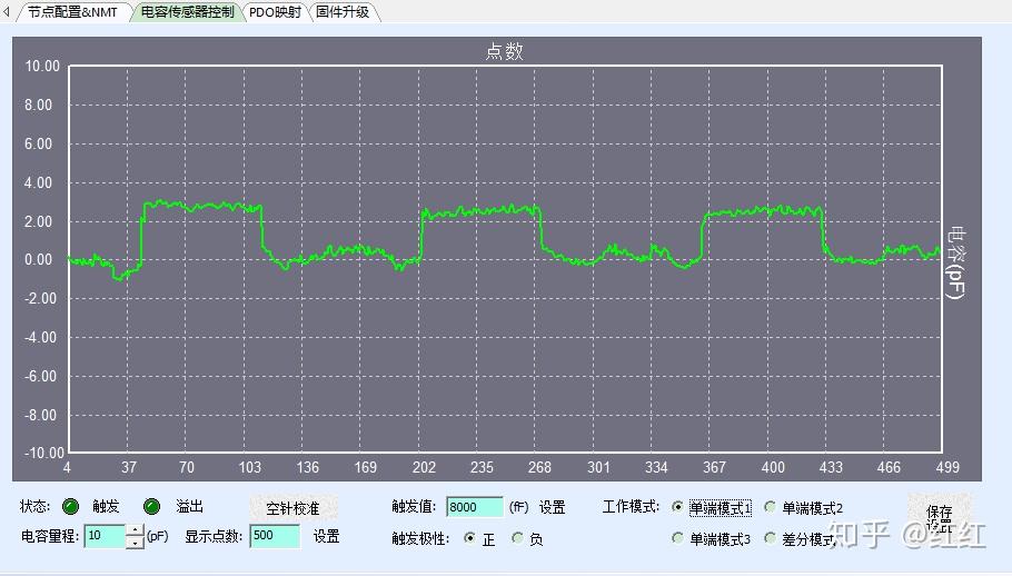 可以看到空针时的电容检测值波动比较大,检测值不稳定。
