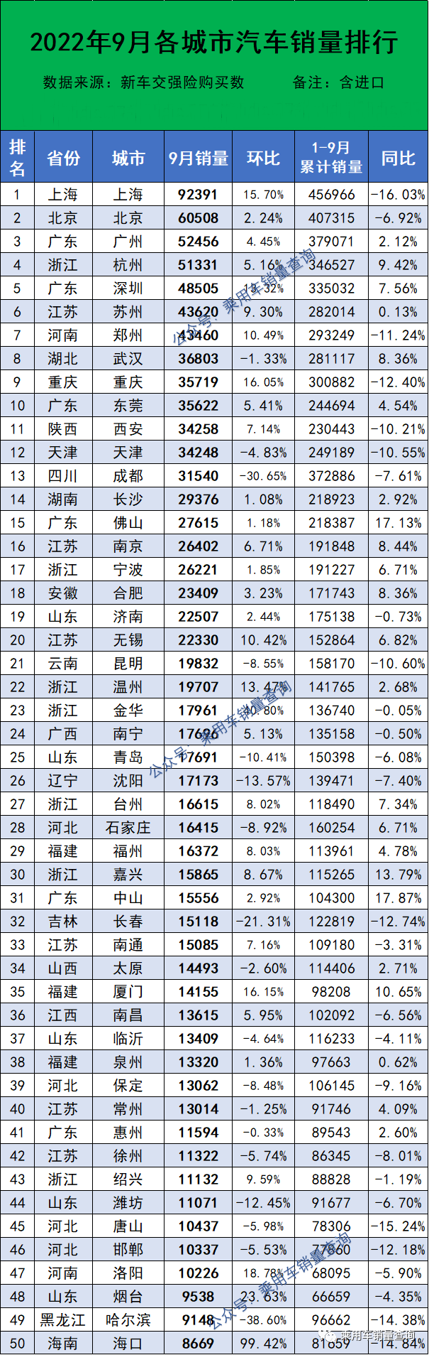就在刚刚,乘用车销量查询公布了2022年9月全国各城市汽车销量排行榜。基于新车交强险数据(含进口)显示:2022年1-9月份国内乘用车累计销量达1476.1万辆,相比去年同期,下滑了4.5%,仅86个城市实现同比增长,占比为25.5%。