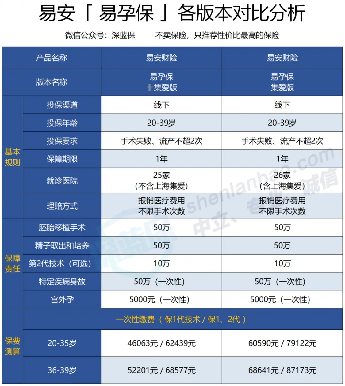 如果预算充足:易安易孕保的保额有 50 万,一年内不限次数报销,但是保费也要贵不少。不过这款产品不保第 3 代试管婴儿技术。