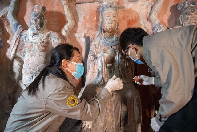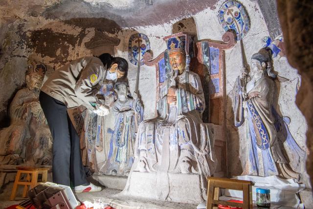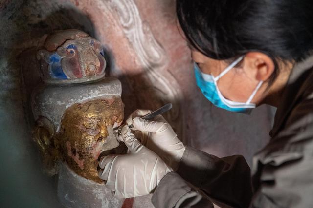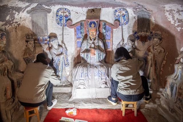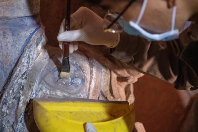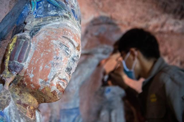 9月22日,大足石刻研究院保护工程中心的工作人员对舒成岩摩崖造像进行本体修复。 新华社记者 唐奕 摄