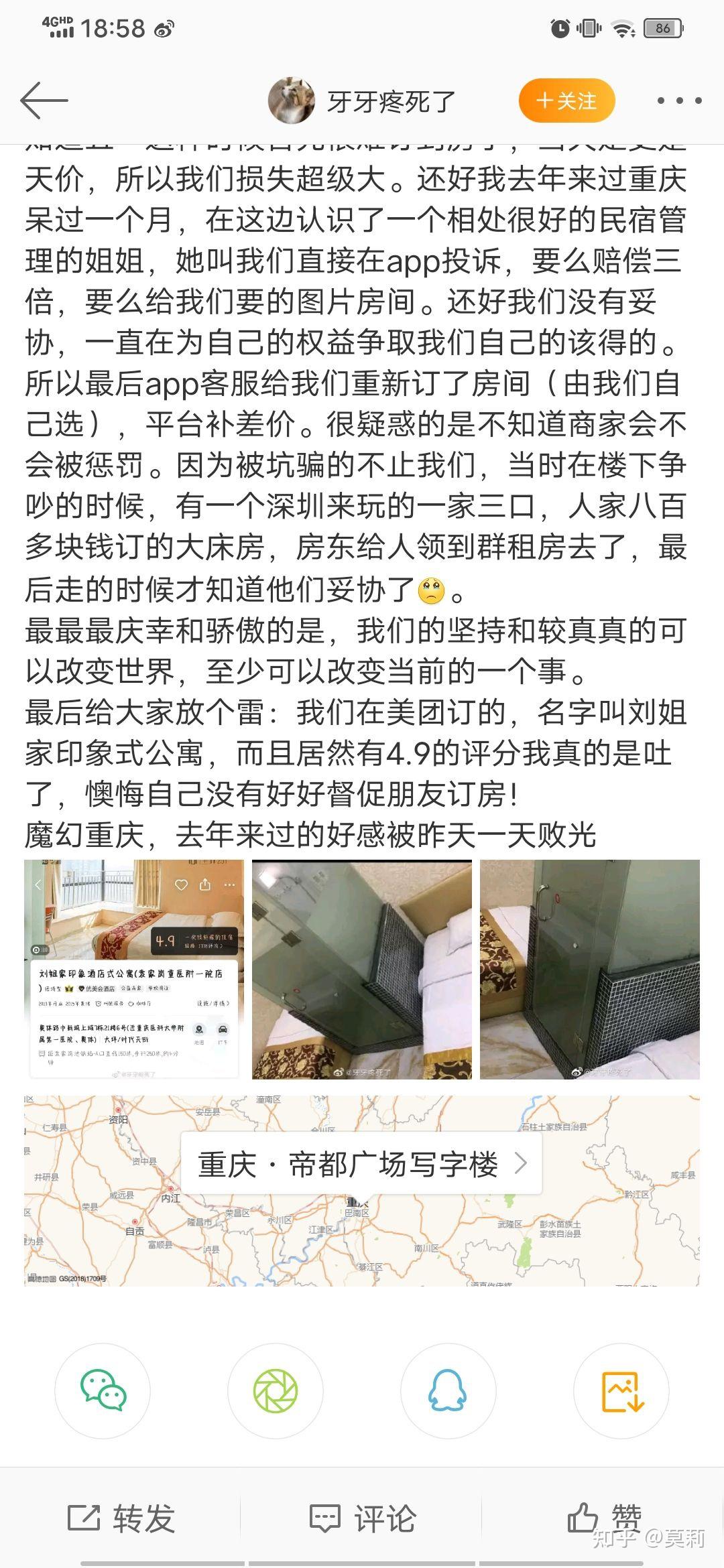 然后逛微博看到的比我们还惨多了去了,说好的阳台房,两床中间夹个厕所,报警都没用,还要她们是白天去住的,可以换。