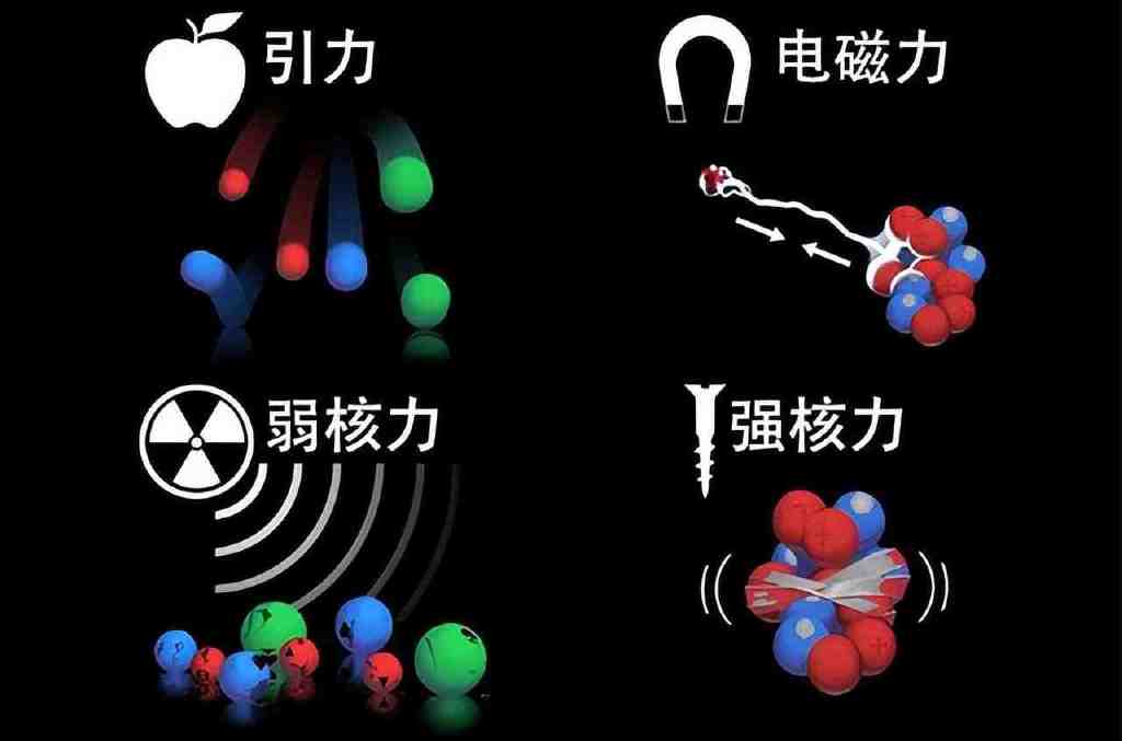 自然界有四种基本作用力,分别是引力,强力,弱力和电磁力。四种力决定着基本粒子该做什么,该怎么做,是基本粒子相互作用的基本法则,决定了基本粒子该如何形成我们每天看到的宏观物体。