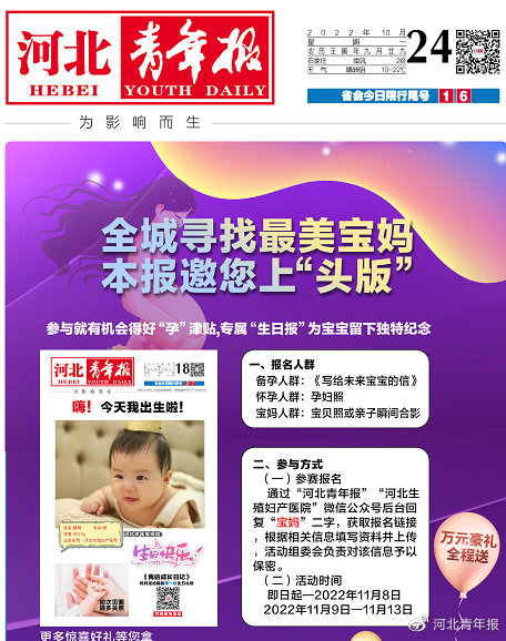 符合条件的宝妈只要参与活动,就有机会得好“孕”津贴,并且还有机会获得河北青年报定制的专属“生日报”,为宝宝留下一份独特的纪念。