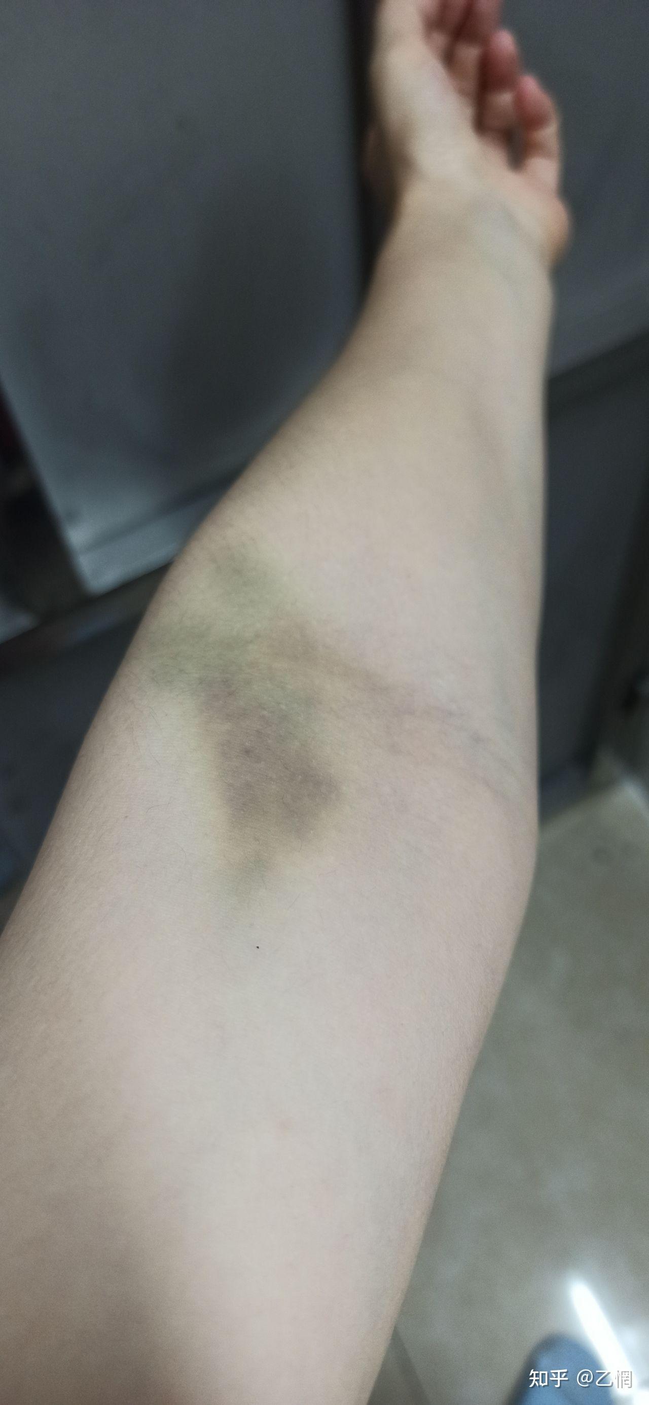 3.促排期间,隔三差五就要抽血,我总是压不好针眼,常常得到一片淤青。前期是右边青完左边青,后期抽血频繁,两边都青了。像这样: