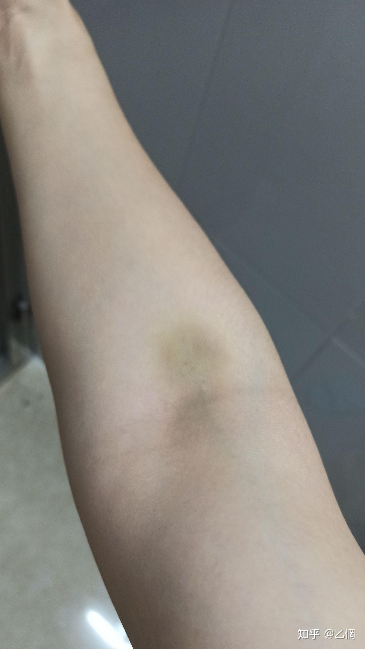 好在不痛,十几天就消了,如果稍加揉搓,一个星期可以消除,但是会有点痛。我平时就容易磕到撞到,淤青对我来说是家常便饭,没啥特别感觉。有人打针类型不一样,胳膊针眼红红一圈,看着挺难受,但是她也觉得没什么。