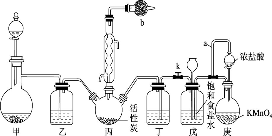 (3)可通过观察导管口气泡逸出的快慢,控制反应过程中装置丙中进气速率,方法是通过观察乙、丁气泡的生成速率来控制甲、庚中分液漏斗的滴加速率;实验结束时,关闭分液漏斗活塞和止水夹k,此时生成的Cl2进入装置戊中,其作用是平衡压强,贮存少量氯气;