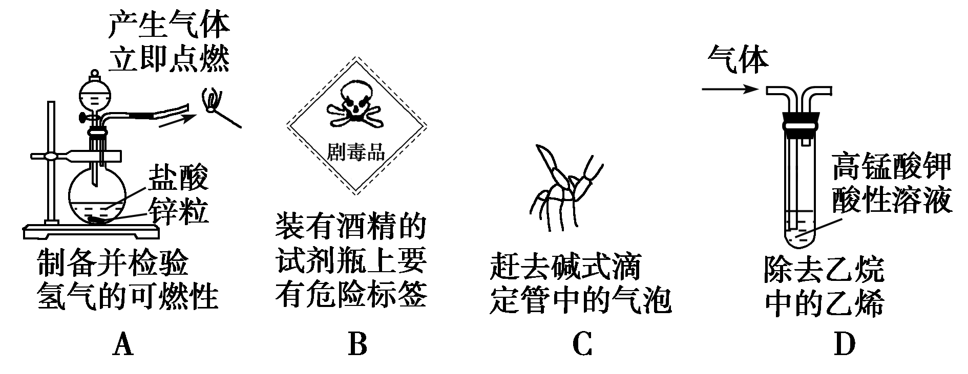 2.C【解析】产生的氢气未经验纯直接点燃,可能会引起爆炸,A错误;酒精为易燃液体,与标签不对应,B错误;用高锰酸钾酸性溶液除去混合气体中的乙烯,会引入CO2杂质,D错误。