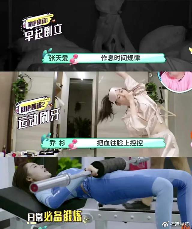 比如一边刷牙一边做拉伸,睡前还要做两小时运动,睡觉还用美容灯照脸 ,
