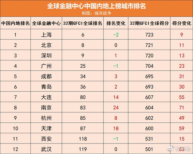 最新GFCI中,中国内地上榜城市数和上期一致,共有12个,分别是: