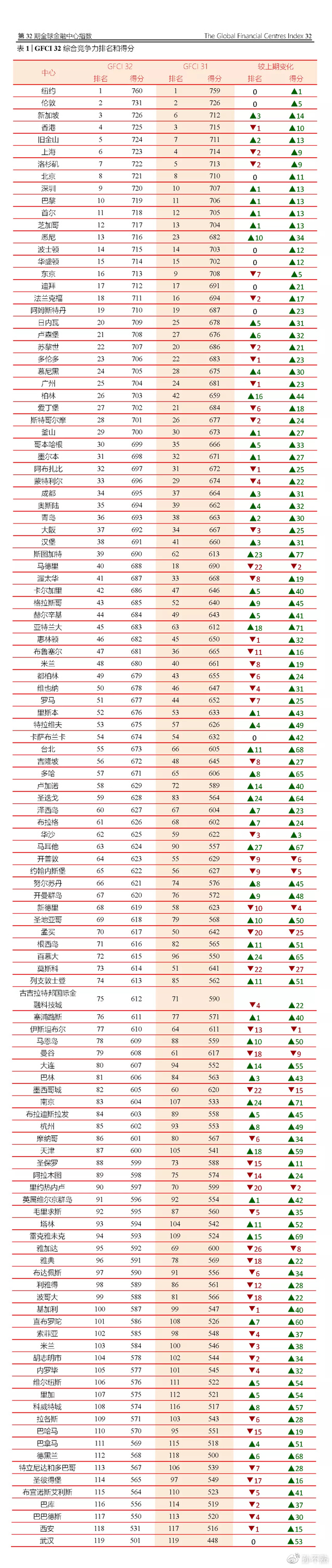 我们再来看下第32期GFCI完整榜单,119个城市上榜
