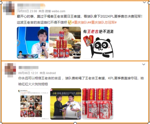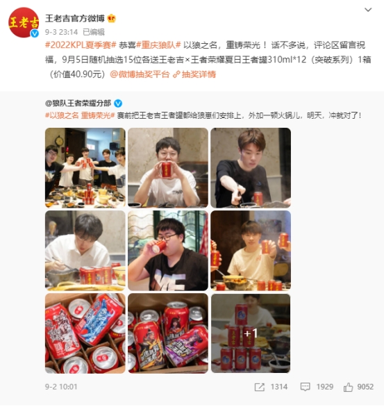 决赛前,狼队聚餐举杯王老吉王者罐为比赛加吉,夺冠后狼队也主动跟王老吉互动点赞王老吉的“吉运”,主动为品牌做口碑传播。随着加入传播的自来水越来越多,王老吉不仅赢得一大波热点和声量,还再一次网罗了新的年轻态生活场景。而狼队等主力队伍赛前吃火锅配王老吉、赛时喝王老吉等动作暗示,将王老吉与美食、组局开黑、举杯庆祝等佐餐场景强关联,也在不知不觉中影响用户了用户的消费行为。