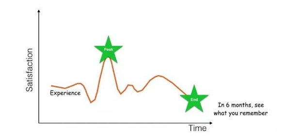 英国诺贝尔获奖者、著名心理学家丹尼尔·卡纳曼(Daniel Kahneman)在研究记忆时曾提到过这样一个规律,人的大脑在经历某次事件后,只能记住「事件中的高潮」和「事件的结束时刻」两个因素。简单来说,消费者对一项事物的体验之后,所能记住的就只是在峰与终时的体验。如果在一段体验的高峰和结尾,体验是愉悦的,那么对整个体验的感受就是愉悦的。宜家1元甜筒体验式营销便是经典案例之一。