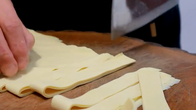 1.把买回来的五花肉炙一下皮,去除腥味。家里没有喷枪可以把锅烧热了,皮朝下烫到焦黄就可以了,用小刀刮干净后清洗干净,然后切成这样小条。