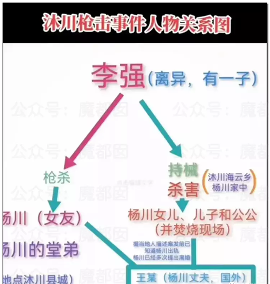 李强在与杨川分手财物发生激烈争执,失去理智,对杨某和其堂弟开枪击伤后,误以为他俩已死,遂扔掉手枪。驾车前往杨某的老家沐川县黄丹镇,想先杀掉杨川的父母,谁知杨川的父母不在家,又将杨某的两个小孩从爷爷家中接到外公外婆家,随后持械将两个孩子杀害。之后,他又杀害了闻讯赶来的孩子爷爷并纵火,烧毁了4间屋。