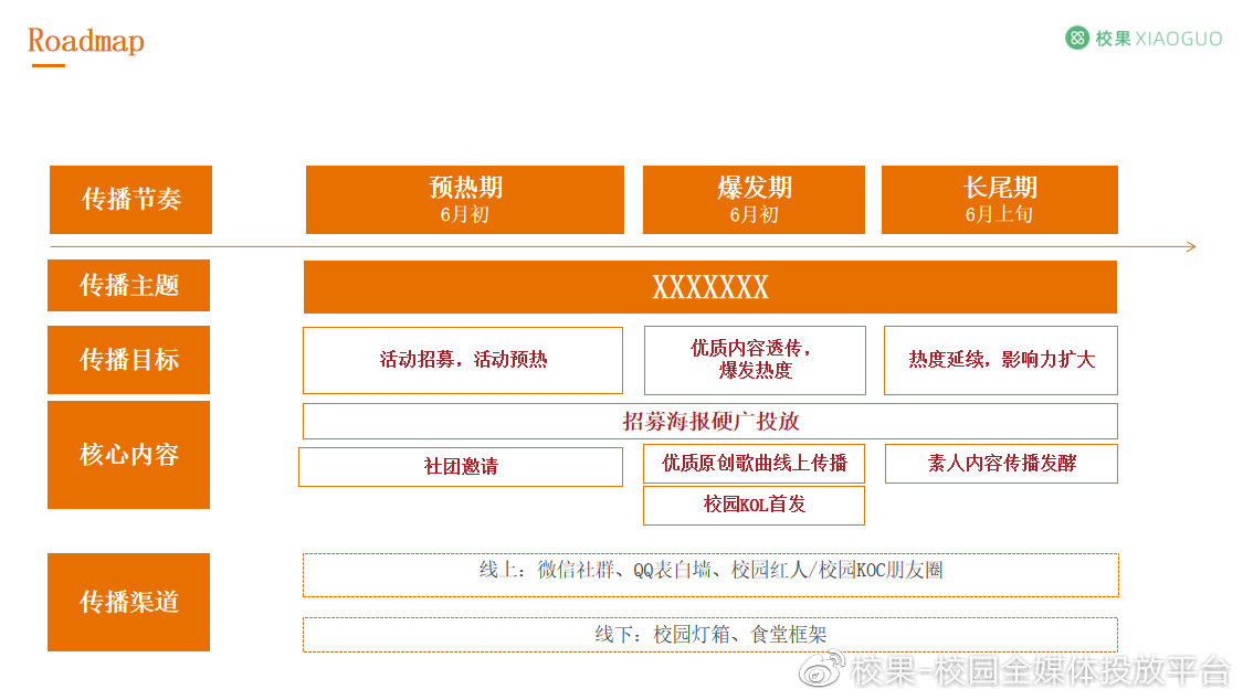 再者,找到合适的校园营销投放平台,与他们进行合作,制定详细的执行时间轴,比如在活动预热期做什么、在爆发期做什么、在长尾期做什么,运用什么样的媒介,是线上媒介、还是线下媒介,投放周期多久等等,毕竟,这些校园营销平台在校园深耕多年,他们比品牌方更懂高校、更懂大学生群体。