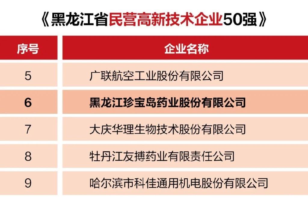 9月24日,黑龙江省优秀民营企业系列表彰名单公示尘埃落定。在相关榜单排名中,珍宝岛药业位列多项“前十”。其中,珍宝岛药业控股股东——黑龙江创达集团位列黑龙江省累计纳税民营企业50强第7位;珍宝岛药业位列黑龙江省民营高新技术企业50强第6位、黑龙江省质量品牌优秀民营企业50强第9位。