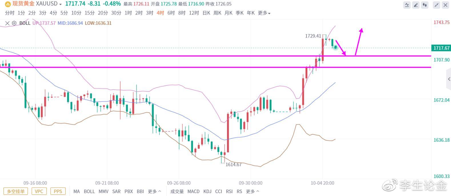黄金价格昨日按照预期延续上涨走势,盘中价格一度冲高至1730美元附近。日线级别,布林带逐步走平,连续阳线反弹使得价格短期很难再走出新的低点,短线价格走势还是震荡偏多,而日内需关注1705-1700一线支撑。4小时,布林带开口向上,价格突破上轨后沿着上轨震荡上行,早间看盘价格小幅回撤,预期日内价格回踩后会再度上扬,日内操作思路回调做多即可,上方关注1730一线的突破情况。