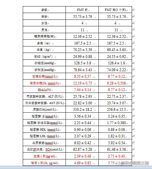 研究数据表明:T2DM患者的症状在FMT治疗后明显减轻。空腹和餐后血糖、HbA1c和尿酸的水平都明显下降,而餐后C-肽的水平明显上升。这些结果表明,FMT(粪菌移植)明显改善2型糖尿病患者相关健康指标。