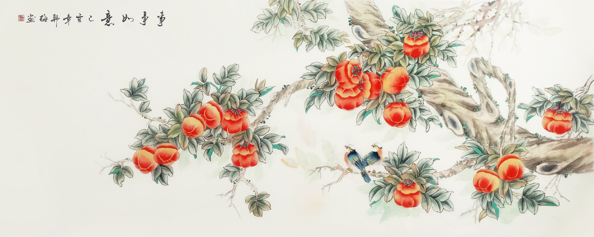 柿与事同音,柿子红润似火,果实圆润饱满,寓意为充足富裕,事事如意。整幅画面充满了丰收吉祥,事事如意,吉利喜庆的感觉,此乃一幅吉祥如意的风水画。
