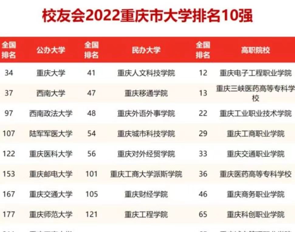 2022重庆高校排行榜已更新,第一名实至名归,重庆医大位列第五!